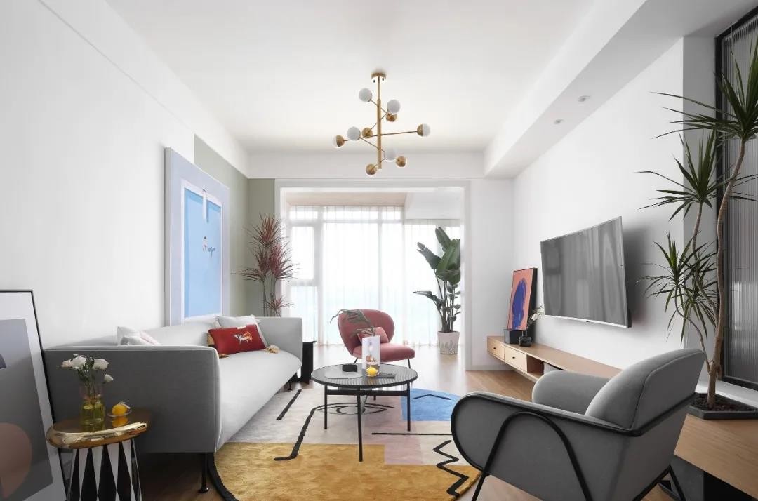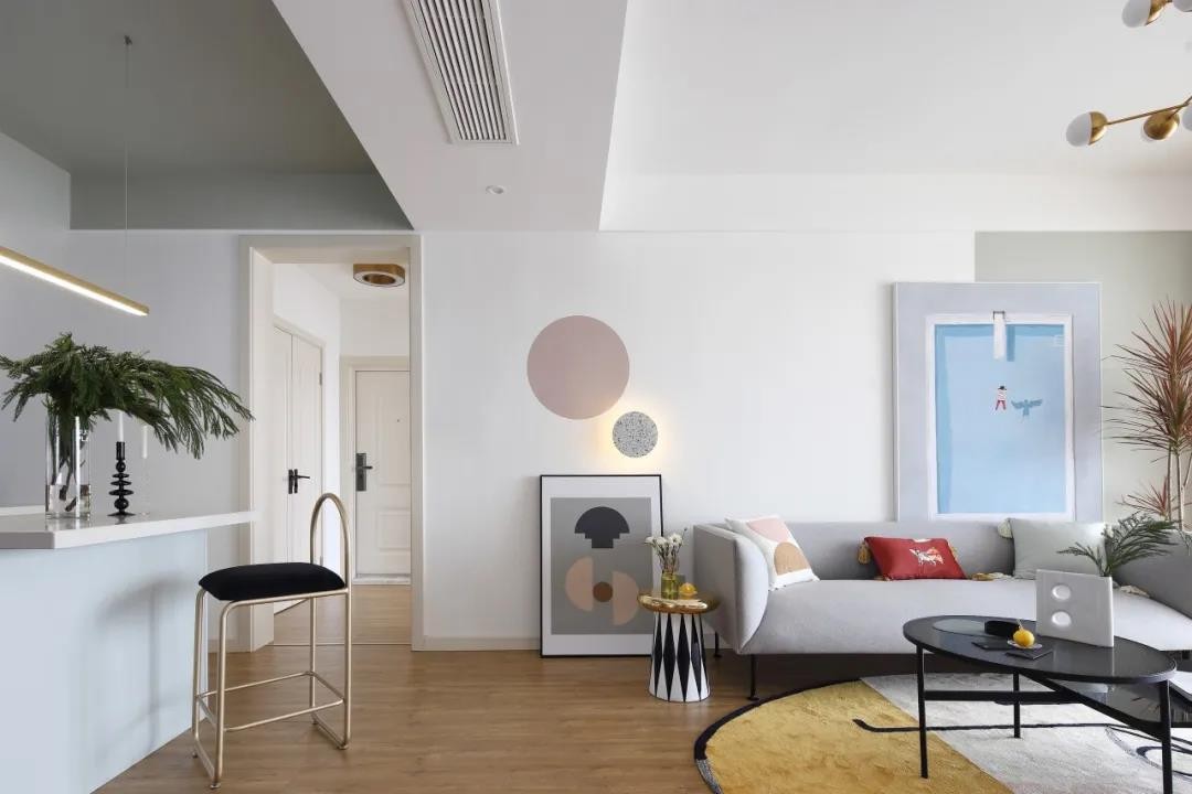 沙發墻潔凈的墻面加入白色與灰色的雙色設計,掛放一幅極簡的掛畫,左側還有兩盞圓形的壁燈?;疑妓嚿嘲l,還有鮮艷活