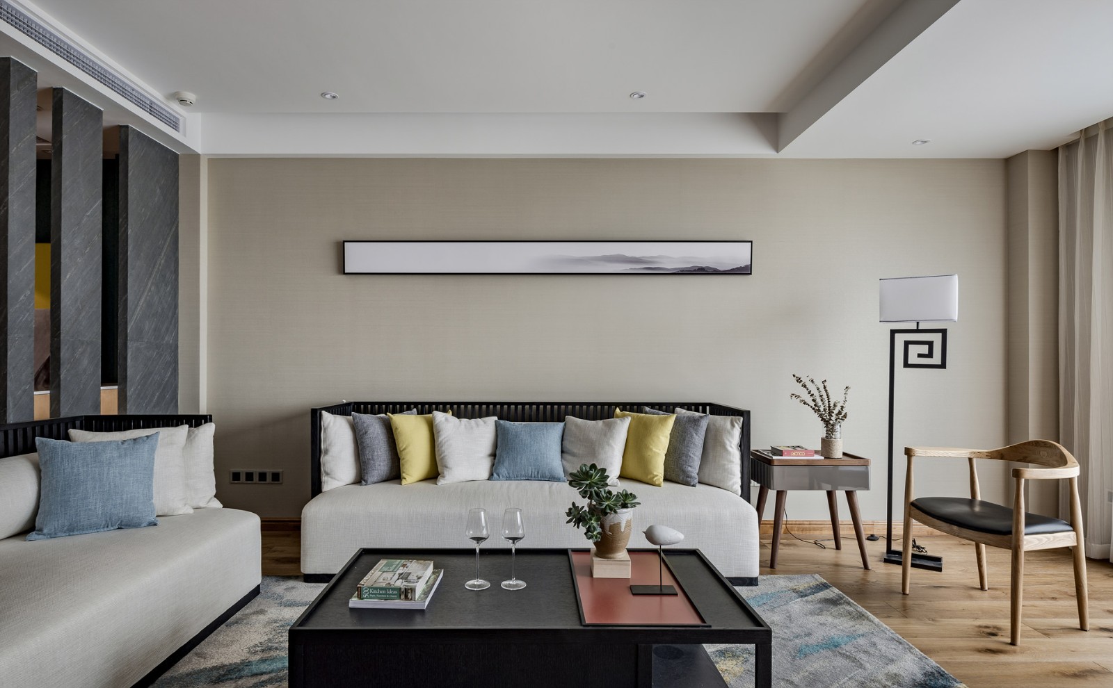 沙發(fā)背景墻珍珠白乳膠漆,新中式特有的落地?zé)簦?jiǎn)單的一副山水掛畫就能體現(xiàn)業(yè)主的品味。
