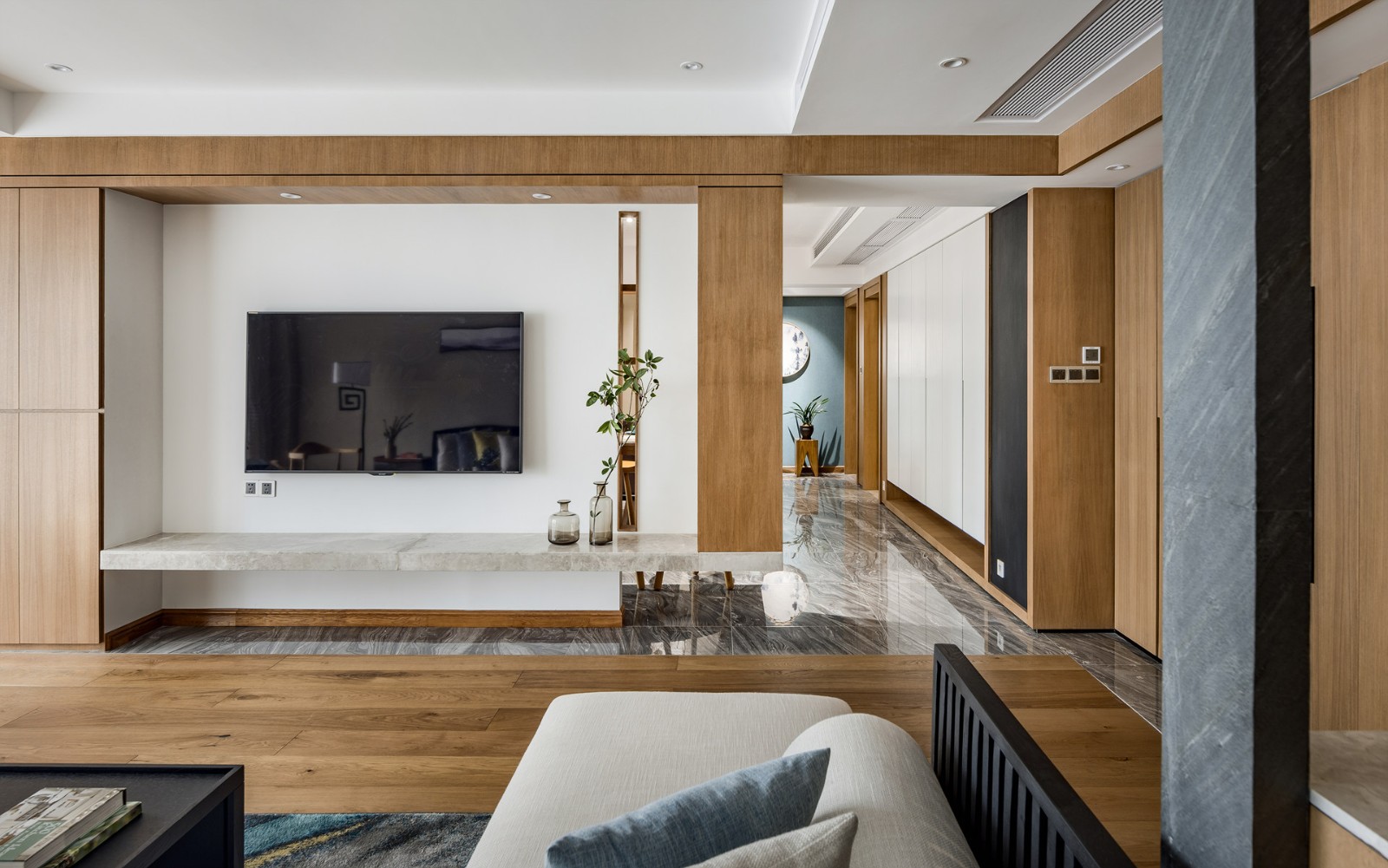 電視背景墻采用原木、大理石、乳膠漆加一點(diǎn)綠植,返璞歸真的生活感受。